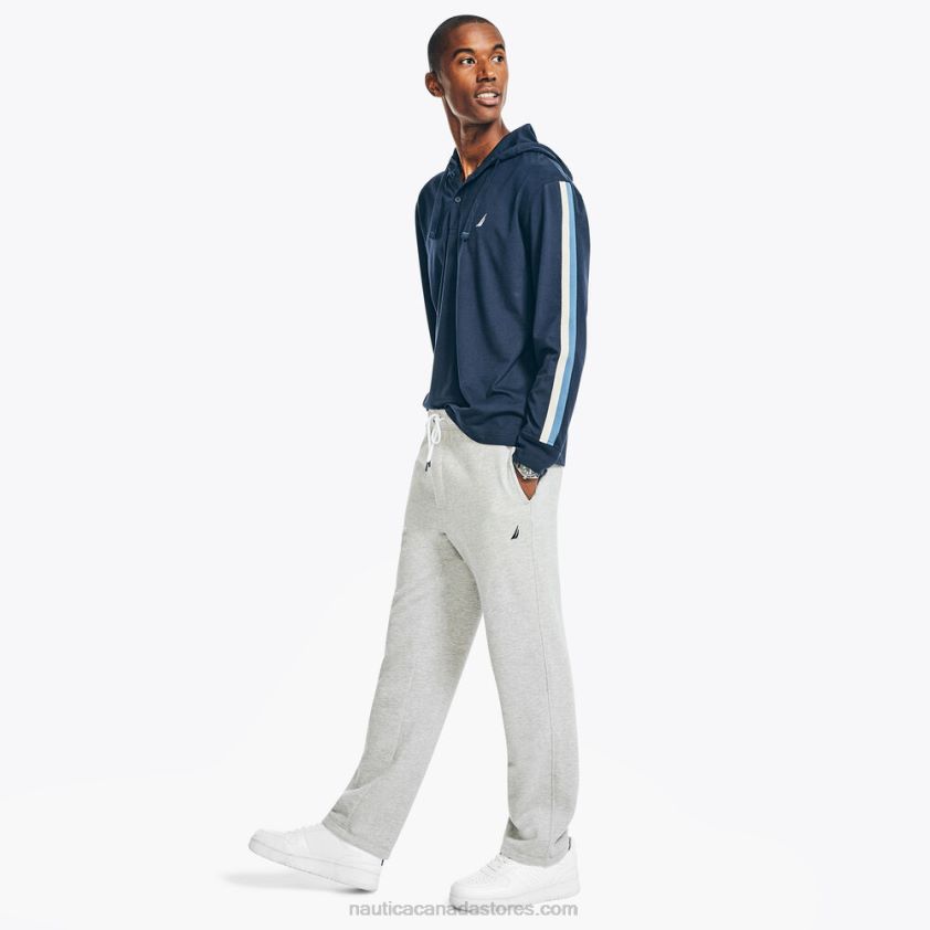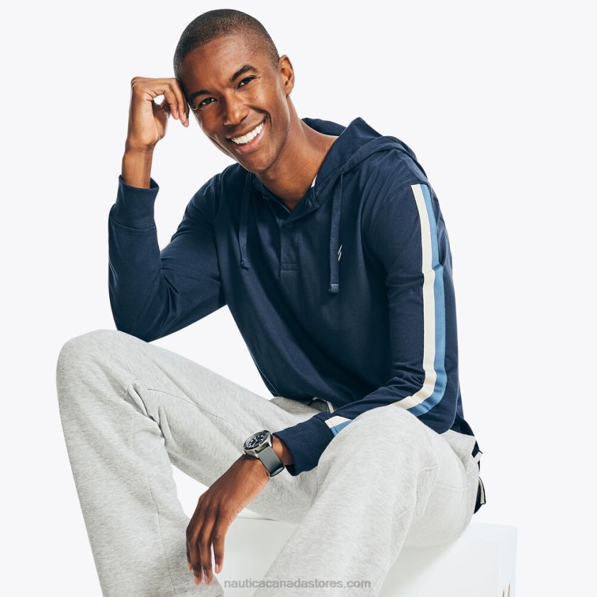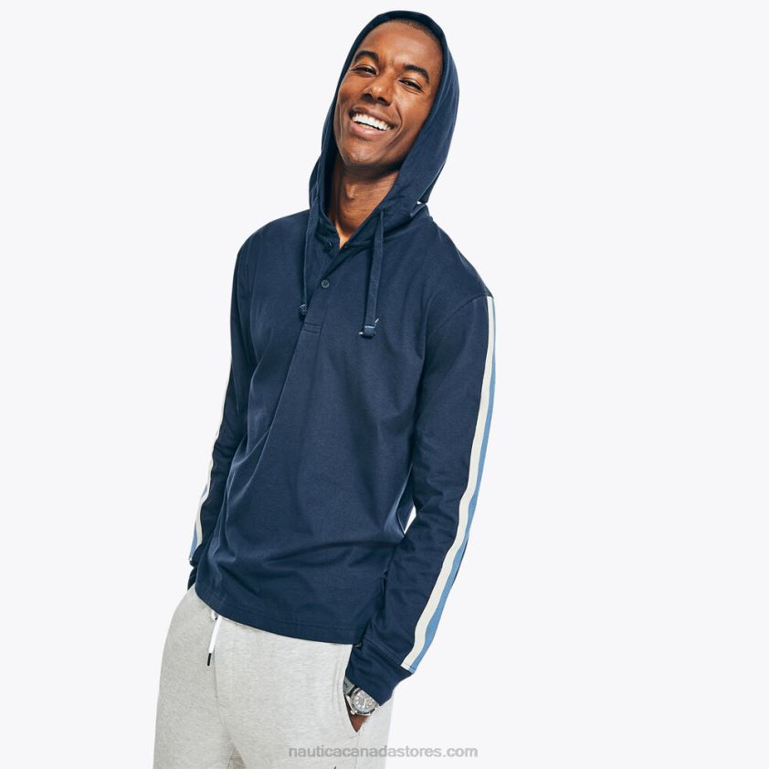 This pullover hoodie is just what your cool-weather wardrobe needs. It's made from recycled cotton-knit and features a drawstring hood, button placket, and multicolor stripes along the sleeves.